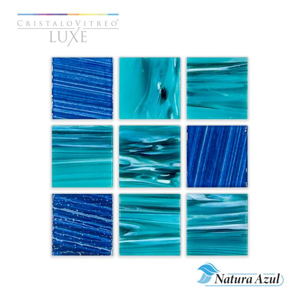 La mezcla Natura Azul de Cristalo Vitreo LUXE fusiona tonos azules profundos y sutiles verdes que evocan la tranquilidad del mar y la vivacidad de la naturaleza. Cada mosaico de 3.5 x 3.5 cm es una obra de arte que transforma tus espacios en refugios apacibles y con estilo, ideal para espacios que requieren expresar dualidad natural dinámica y refinada en el ambiente.